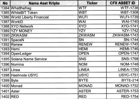 Berdasarkan Surat Keputusan Direksi Nomor CFX/DIR-SK/017/X/2025 yang diterbitkan pada Jumat (10/10/2025), jumlah aset kripto yang masuk dalam daftar resmi tersebut naik dari 1.414 token pada September lalu.
