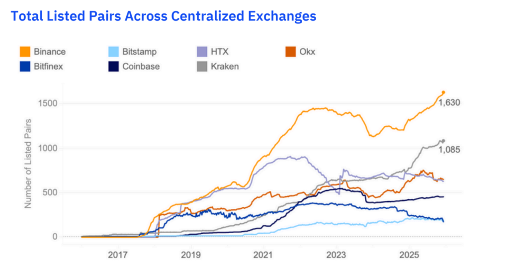 Siklus ini memperkuat kedalaman pasar dan menjadikan Binance sebagai pusat konsolidasi aktivitas perdagangan, terutama sejak 2019, sebagaimana tercermin dalam data jumlah pasangan perdagangan versi Kaiko.
