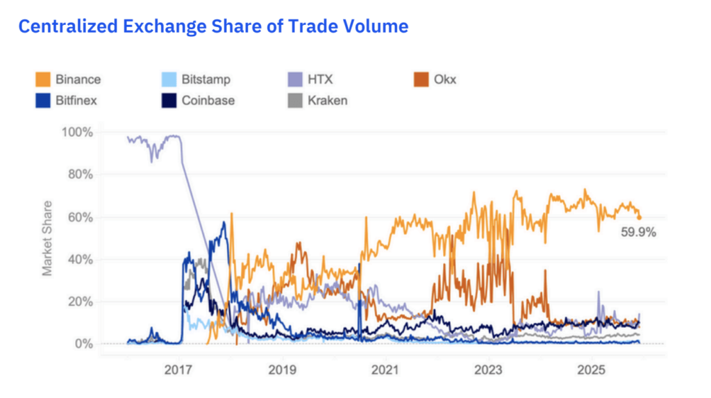 Adapun sejak 2019, pangsa volume global Binance terus meningkat dan relatif stabil di kisaran 60 persen dari total volume spot exchange terpusat.