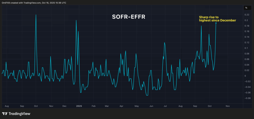 Selisih antara Secured Overnight Financing Rate (SOFR) dan Effective Federal Funds Rate (EFFR) naik tajam dari 0,02 ke 0,19 dalam sepekan, level tertinggi sejak Desember 2024. Kenaikan ini menandakan pendanaan di pasar uang Amerika Serikat semakin ketat dan biaya pinjaman jangka pendek meningkat.