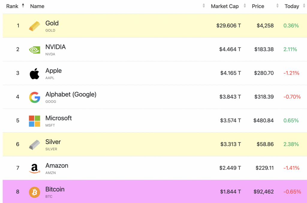 Adapun, data CompaniesMarketCap turut menunjukkan bahwa emas dan perak menempati jajaran aset global teratas berdasarkan kapitalisasi pasar, masing-masing di posisi pertama dan keenam, sementara Bitcoin berada di urutan kedelapan.
