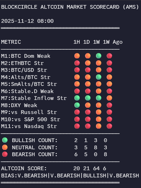 Gambar di atas menampilkan contoh tampilan skor AMS ala Blockcircle (bergaya terminal) dengan stempel waktu, daftar metrik, serta agregasi bullish/neutral/bearish. Tujuannya edukatif: membantu menentukan kapan agresif dan kapan menahan diri.