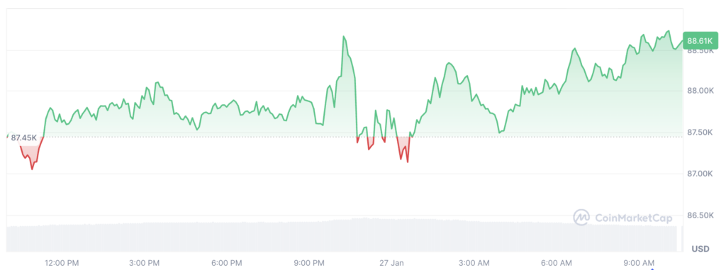 Data CoinMarketCap pada Selasa (27/1/2026) menunjukkan Bitcoin memang sempat bangkit dari level terendah pekan ini di sekitar US$86.000 ke US$88.600. Namun, kenaikan tersebut masih terbatas, hanya sekitar 2 persen dalam 24 jam terakhir, dan belum cukup kuat untuk membawa harga kembali menembus US$90.000, level yang terakhir disentuh pada akhir pekan lalu.