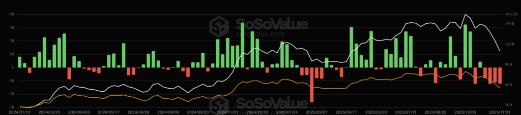 Arus keluar dari produk exchange-traded fund (ETF) Bitcoin spot di Amerika Serikat kembali berlanjut. Data terbaru dari SoSoValue mencatat investor menarik dana sebesar US$1,22 miliar atau setara Rp20,3 triliun hanya dalam sepekan yang berakhir pada 21 November 2025, menjadikannya salah satu outflow mingguan terbesar sejak produk tersebut dirilis pada Januari 2024.