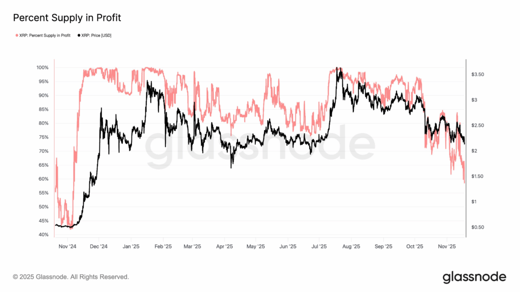 Dalam postingan X Glassnode pada Senin (17/11/2025), metrik pasokan XRP yang mencatat keuntungan kignalevel terendah dalam 12 bulan terakhir. Posisi serupa terakhir terlihat pada November 2024 ketika harga XRP berada di kisaran US$0,53.