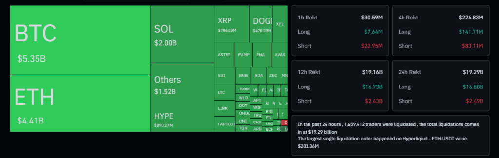 Bitcoin (BTC), Ethereum (ETH), dan Solana (SOL) menjadi tiga aset dengan nilai likuidasi terbesar dalam peristiwa ini. Catatan paling mencolok datang dari exchange Hyperliquid, di mana satu transaksi tunggal untuk pasangan ETH-USDT senilai US$203,36 juta dilikuidasi. Secara keseluruhan, lebih dari 1,6 juta trader tercatat kehilangan posisi mereka dalam satu hari.