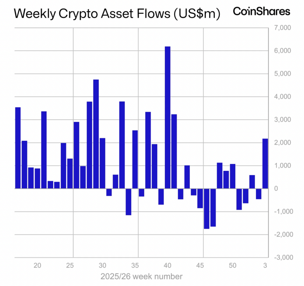 Produk investasi aset kripto global mencatatkan arus dana masuk signifikan pada pekan lalu, sekaligus menjadi periode inflow terbesar sepanjang 2026 sejauh ini. Laporan terbaru CoinShares menunjukkan bahwa produk Exchange-Traded Product (ETP) kripto membukukan arus masuk bersih sebesar US$2,17 miliar atau sekitar Rp34,7 triliun, tertinggi sejak Oktober 2025.