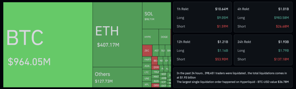 Bitcoin (BTC) dan Ethereum (ETH) masing-masing mencatat likuidasi long besar senilai US$931 juta dan US$374 juta, disusul Solana (SOL), Hype (HYPE), dan altcoin besar lainnya. Secara keseluruhan, lebih dari 398 ribu trader terkena likuidasi dalam 24 jam, termasuk posisi BTC-USD terbesar yang terhapus di platform DEX Hyperliquid.