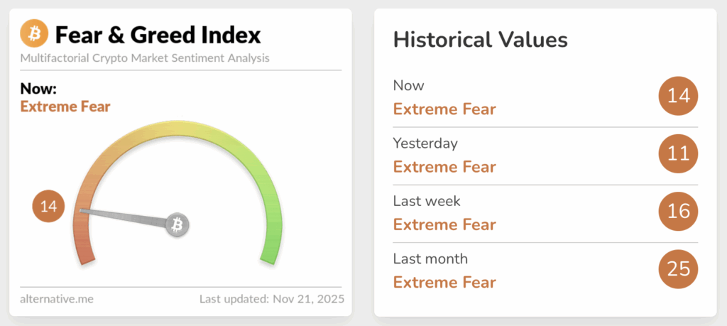 Sentimen investor ritel merosot drastis. Fear & Greed Index kripto turun ke level 14 hingga artikel ini ditulis, masuk zona ketakutan ekstrem dan menjadi posisi terendah sejak akhir 2022.