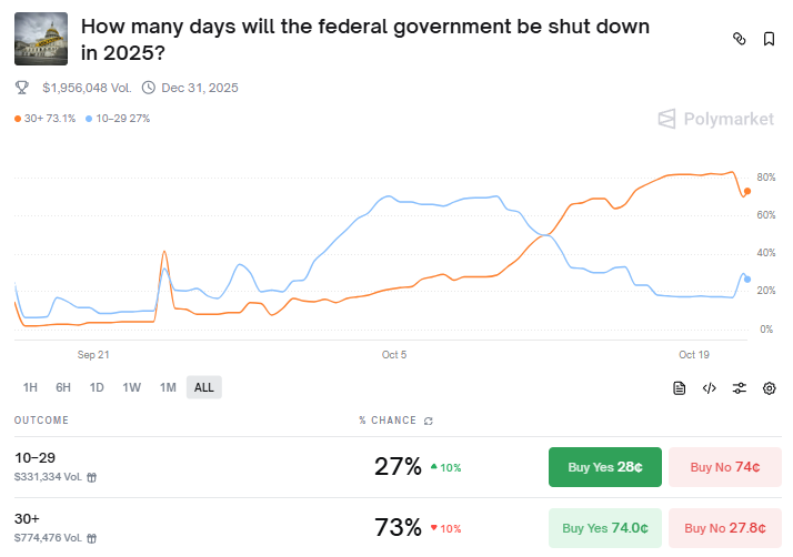 Namun, peluang shutdown berakhir pekan ini masih belum pasti. Berdasarkan data dari pasar prediksi Polymarket, probabilitas bahwa penutupan ini akan berlangsung lebih dari 30 hari mencapai 73%, yang berarti berpotensi berlanjut hingga setidaknya akhir Oktober 2025.