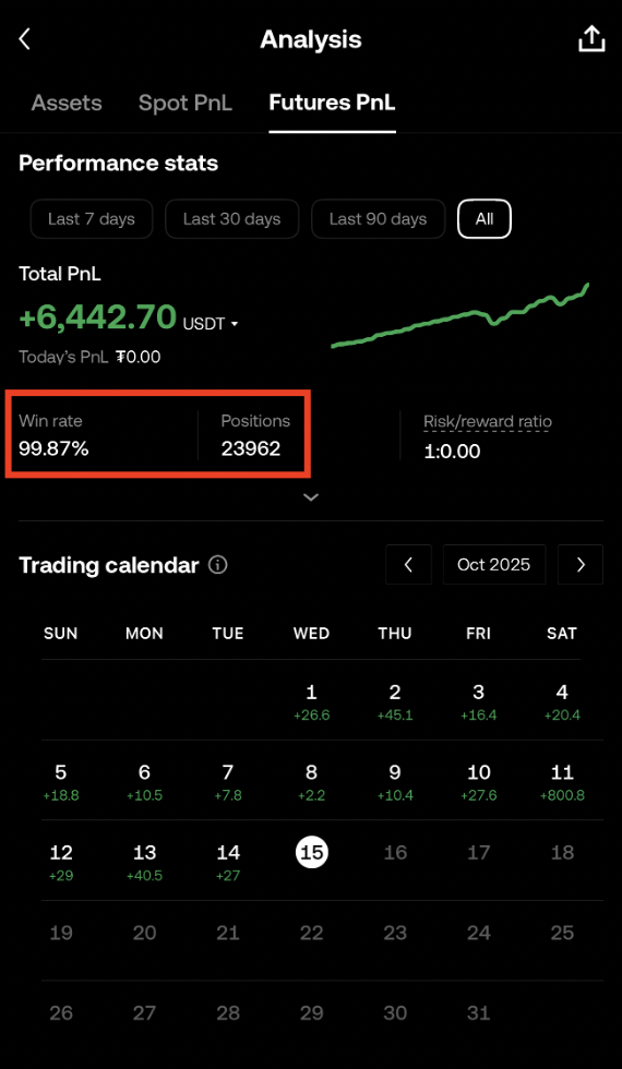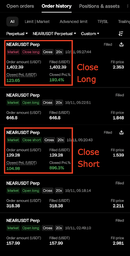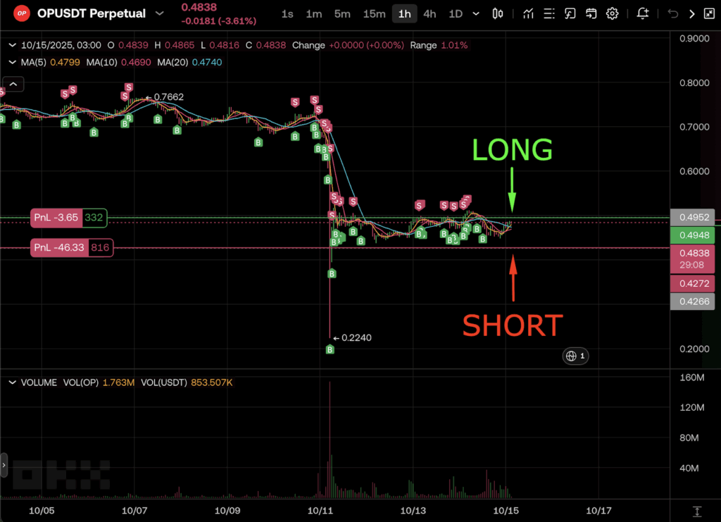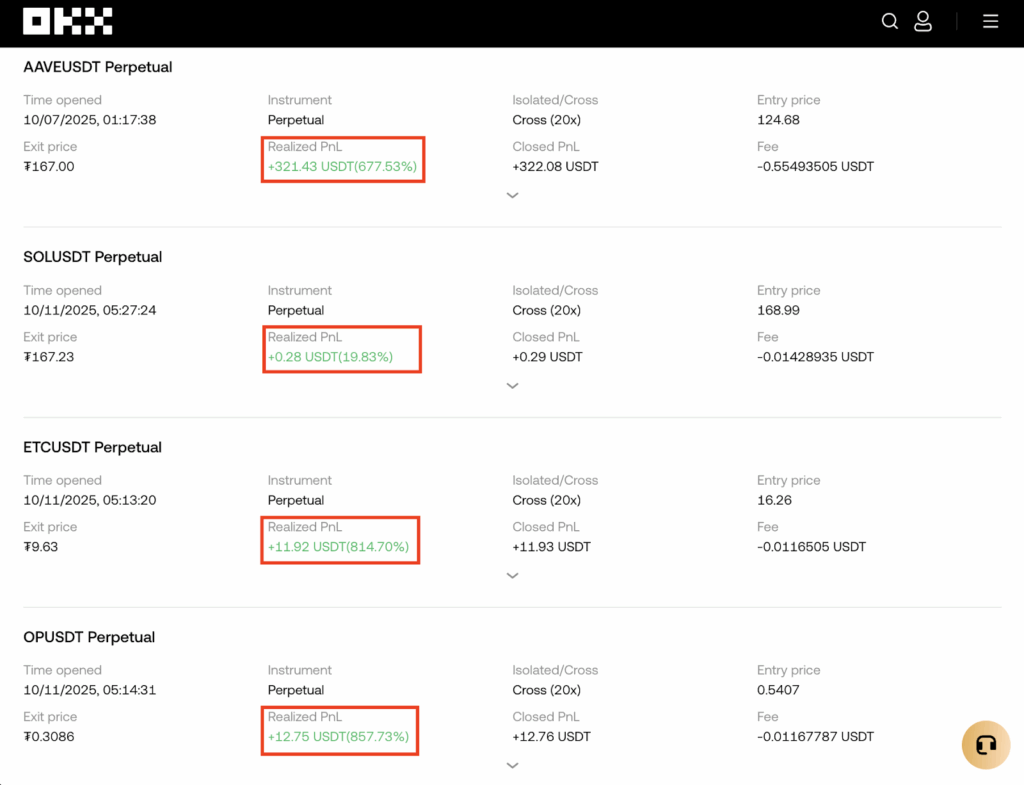 Ketika harga mulai jatuh, posisi long memang sempat merugi sementara, tetapi posisi short yang aktif menangkap pergerakan turun, menyeimbangkan kerugian dan menjaga stabilitas portofolio. Pendekatan hedging dua arah ini membantu sistem tetap produktif di pasar bullish maupun bearish.