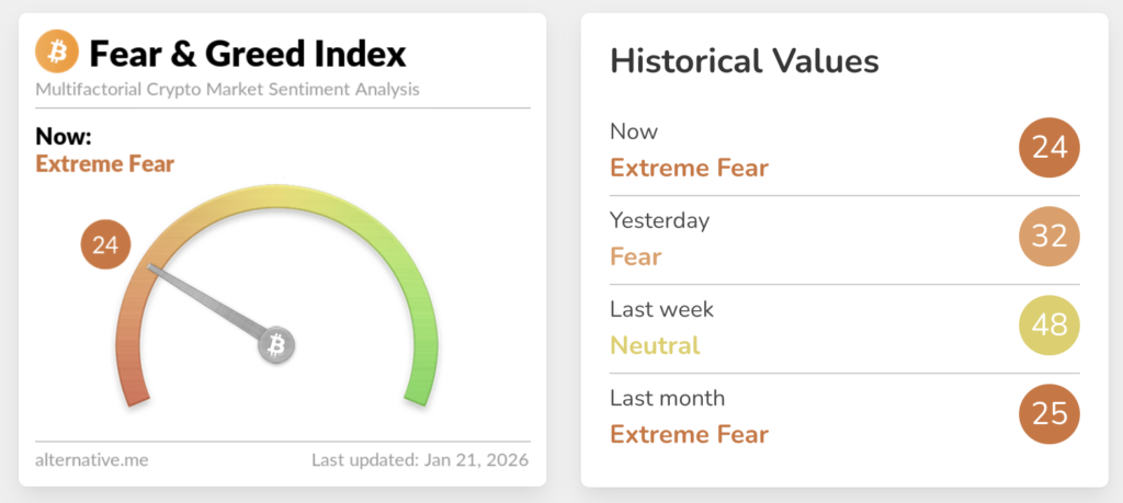 Indeks Crypto Fear & Greed tercatat berada di level 24, yang mengindikasikan kondisi “extreme fear” atau ketakutan pasar.