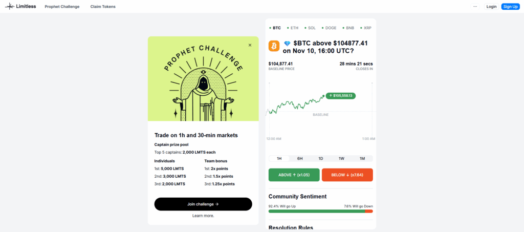 Limitless hadir sebagai prediction market terdesentralisasi di jaringan Base. Fokus utamanya adalah market cepat untuk aset kripto, didukung biaya transaksi rendah dan eksekusi on-chain, menjadikannya menarik untuk trader yang mengejar peluang jangka pendek.