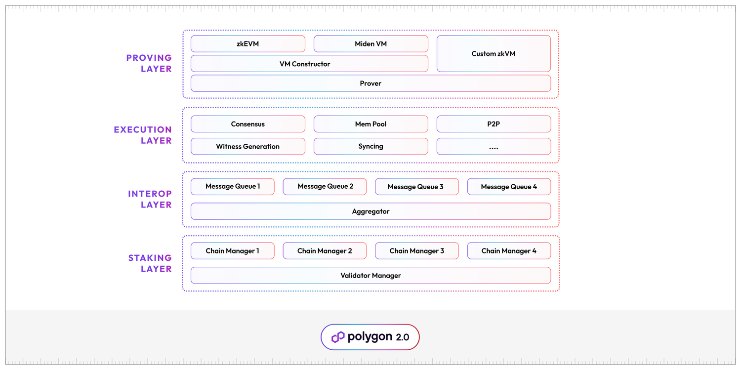 Polygon 2.0 akan memiliki struktur empat layer yang dirancang untuk meningkatkan keamanan dan skalabilitas jaringan sembari membuat transaksi menjadi lebih aman dan instan. Empat layer tersebut adalah: